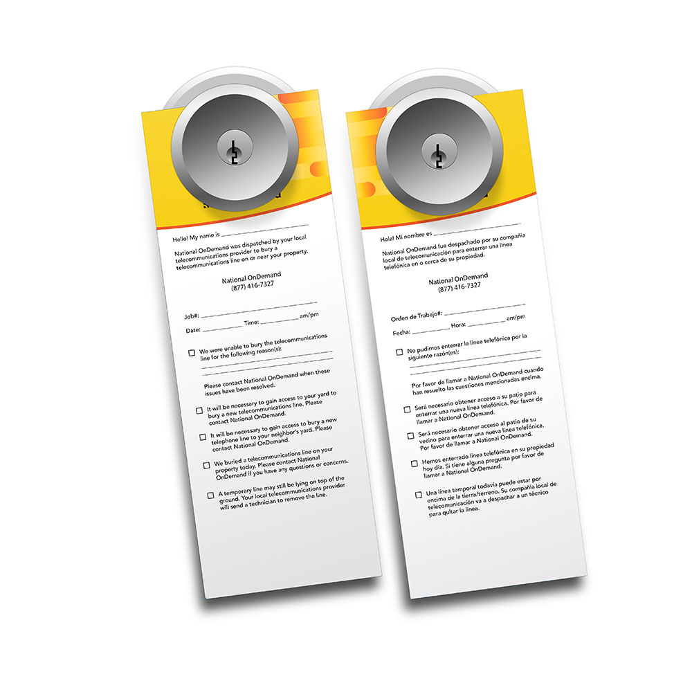 These two-sided door hangers are tailored for Brightspeed crews to leave at customer premises when burying or attempting to bury telecommunications lines. One side is in English, and the other side is in Spanish, making them suitable for diverse communities. Each hanger features: